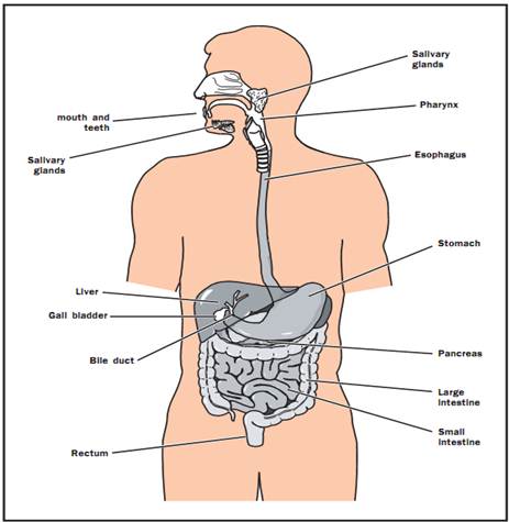The human digestive system is responsible for food ingestion and digestion as well as the absorption of digested food molecules and the elimination of undigested molecules. It consists of a long tube called the gastrointestinal tract or GI tract (alimentary canal) and several accessory organs. The major components of the GI tract are the mouth, pharynx, esophagus, stomach, small intestine, and large intestine. The major accessory organs are the teeth, salivary glands, liver, gallbladder, and pancreas.