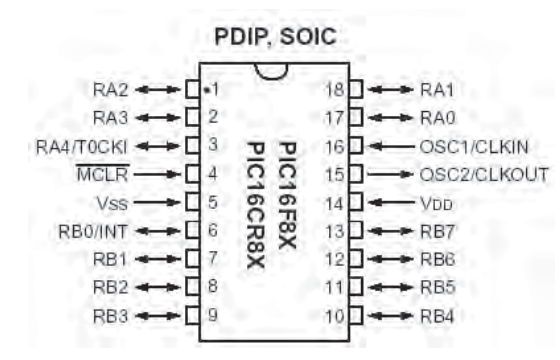 وكما هو موضح في الشكل له 18 طرفاً. يستعمل 13 طرفاً. RA4- RAO RB7- RBO كمداخل ومخارج. عند برمجتها كمخارج يمكن وصل ثنائي ضوئي مباشرة مع هذه المخارج لأنها تخرج تياراً مقداره 20 ميلي أمبير.