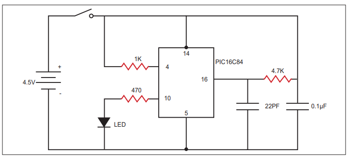 أما المنافذ 15، 16 فيتم استخدامها من أجل توصيل المذبذبات. يبين الشكل التالي دارة وماض (Flasher) باستخدام المتحكم الدقيق PIC 16C84.