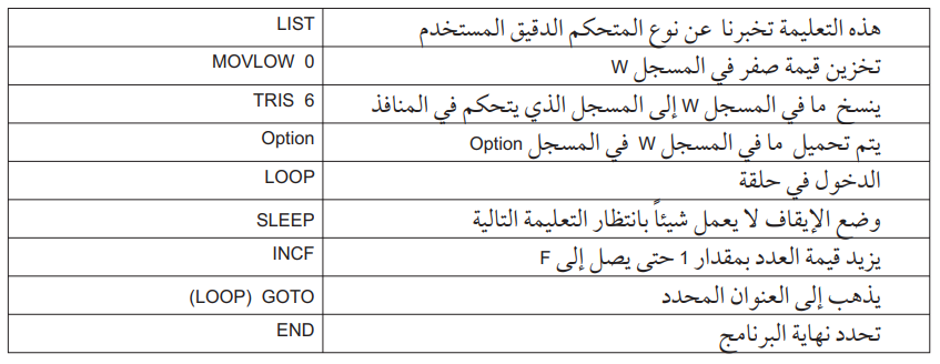 يتم استخدام مذبذب من نوع RC، والمخرج RB4 لتوصيل الثنائي الضوئي. ويكون البرنامج الذي يؤدي عمل الوماض مكتوباً بلغة التجميع (Assembley language) كما يلي: