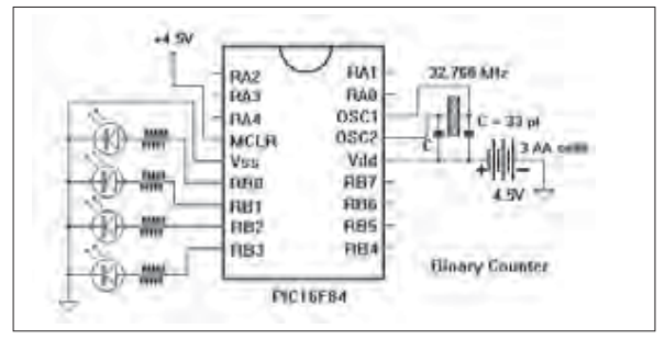 يبين الشكل التالي دارة عداد ثنائي باستخدام المتحكم الدقيق PIC16F84 .