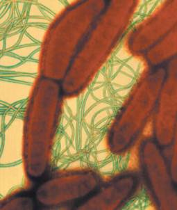 Colored transmission electron micrograph of the rod-shaped E.coli bacteria, showing its long flagellae.