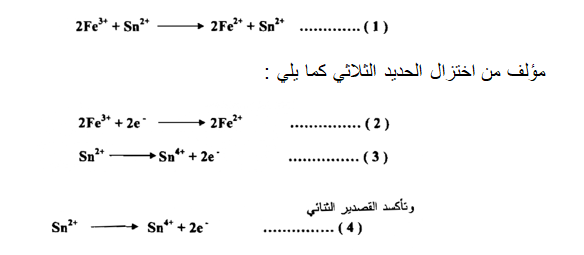1 - التفاعل بين أيون الحديد الثلاثي (Fe (III والقصدير الثنائي (Sn (II ينتج حديد ثنائي ( Fe ( II وقصدير رباعي (Sn (IV
