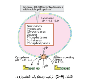 تتكون اللايسوزومات من حشوه كثيفة تحاط بغشاء اللايسوزومات على إنزيمات محللة مثل الرايبونيوكليزRibonuclease , دي اوکـسي رايبونيـــــــوکلیز Deoxyribonuclease ، فوس فاتيز Phosphatase، كلايكوسايديز Glycosidase ، اللايبيز Lipase سلفاتيز Sulphatase البروتينيز Proteinase، فوسفولايبيز Phospholipase وغيرها (الشكل9-2)، ومن المعلوم إن هذه الإنزيمات تبقى غير فعالــــة مــــا دامت موجودة داخل اللايسوزومات. أما عند تمزق جدار اللايسوزومات تنطلق هذه الإنزيمات الى الخارج مؤدية الى هضم الخلية نفسها Autolysis. وتهضم البكتيريا بوساطة خلايا الدم البيض وذلـــك بـــان تــــوم بتطويق البكتيريا وتطلق الإنزيمات المحللة الموجودة داخل اللايسوزومات.