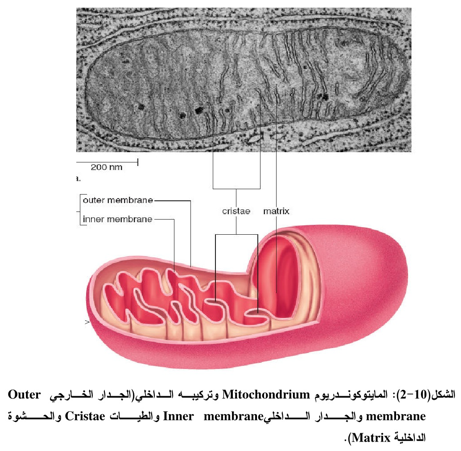 المايتوكوندريا (المفرد المايتوكوندريوم (Mitochondrium) عبارة عن تراكيب خلوية بيضوية الشكل محاطة بغشاء خارجي أملس يحتوي على مسامات Pores يطلق عليها اسم بورن porin وهــــي قـنــــوات (بروتينية) غير تخصصية تسمح بمرور المركبات ذات الأوزان الجزيئية التي تقل عن 10 كيلو دالتون بآلية الانتشار Diffusion، وإنزيم بالموتيل مرافق الإنزيم Palomity on A) وغشاء داخلي يبرز منه طيات (انثناءات) تدعى Cristae والتجويف الداخلي الذي يدعى بالحشوة Matrix (الشكل 10-2) وتحتوي الأخيرة على البروتينات والإنزيمات اللازمة لعملية أيض المواد الغذائية لإنتاج الطاقة ولذلك تعـرف المايتوكوندريا بمركز أنتاج الطاقة، وعليه فهي تكثر في الخلايا والأنسجة ذات النشاط الحيوي الكبير مثــل الخلايا الداخلية وخلايا عضلة القلب. ويحتوي الغلاف الداخلي للمايتوكوندريا على المكونات الآتية: