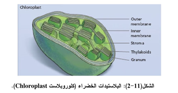 البلاستيدات تراكيب خلوية أهمها البلاستيدات الخضراء (كلوروبلاست)Chloroplasts (الشكل11-2) وهي مستقلة في مادتها الوراثية وإنزيماتها وبروتيناتها، كما هو الحال في المايتوكوندريا. وتمثل مركز البناء في الخلية وإنتاج المركبات الغذائية وبذلك تعمل عكس عمل المايتوكوندريا وظيفيا. ويقتــصـر وجـود البلاستيدات على النباتات الراقية والبسيطة والطحالب الدقيقة وتتفاوت في أعدادها وأنواعها بين نوع وآخـــــر وتقسم البلاستيدات من حيث أنواعها الى بلاستيدات خضراء Chloroplasts تقوم بعملية التمثيل الضوئي Photosynthesis وبلاستيدات ملونة Chromoplasts تحتوي على أصباغ ملونة تعطي الألوان كما في بعض الأزهار والثمار الناضجة بالإضافة للبلاستيدات عديمة اللون Leucoplasts التي تعمل على تخزين المواد الغذائية النشوية والدهنية والبروتين كما هو الحال في الجذور الخازنة (الجزر) والسيقان (البطاطا) والبذور (الباقلاء والفاصوليا).