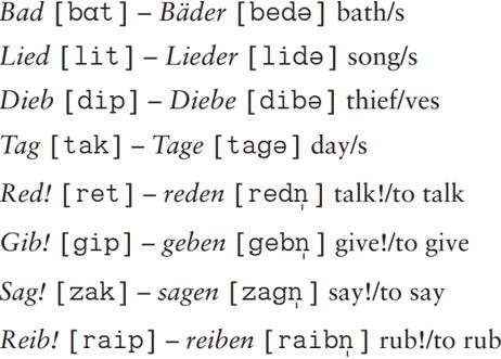 Both words are pronounced with final [t] sound, but the difference in spelling here has a rational basis rather than being simply a historical quirk, as is evident from their plural forms: in the plural of Rad (Räder) the [d] sound is restored, while in that of Rat (Räte) the final [t] remains. This is not merely a fact about Rad and Rat: a whole range of singular/plural pairs have a voiceless word-final consonant which becomes voiced when a suffix is added; the same pattern is observed too for some imperative and infinitive pairs: