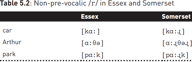 In spite of the fact that Essex speakers do not pronounce the /r/ in these words, many phonologists would argue that their underlying representations of each of these words is the same as that of their Somerset counterparts, i.e. that even for an Essex speaker car is underlyingly