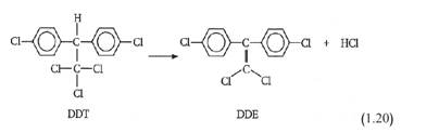 يتفكك هذا المركب ببطء شديد في الماء والتربة بتفاعلات إزالة الكلورة، وأحد النواتج التي وجدت ضمن ظروف مُرجعة هو الـ د.دي.، أي إيثان ثنائي كلور ثنائي فينيل ثنائي الكلور DDE) Dichlorodiphenyldichloroethene) (التفاعل 1.20).