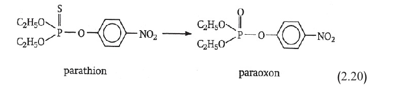 وتُبدي أحياناً نواتج التفكك سمّية معززة، على غرار حالة المركبات الفوسفور العضوية. فالمركبات التي من قبيل الباراتيون (parathion) تسمى ثيوات الفوسفور (phosphorothioate بسبب وجود المجموعة PS في صيغتها. وضمن الخلايا، تحول الإنزيمات الغنية بالأكسجين هذه المجموعة إلى مجموعة P=O (التفاعل 2.20).