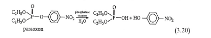 ويخضع كل من الباراكسون والباراثيون إلى التفكك بتفاعلات حلمهة يؤدي فيها الماء دور أليف النوى .(nucleophile). وتتحفّز هذه التفاعلات في المتعضيات بإنزيمات إزالة فوسفات (phosphatase) مختلفة التفاعل 3.20 إلا أن وجود كبريت ملحق بالفوسفور في الباراثيون بدلاً من الأكسجين في الباراكسون يقلص النزعة إلى التفاعل مع أليف النوى (يمكن لأليف النوى، إضافة إلى الماء أن يكون أيضاً الجزء الأليف للنوى في الـ (ACE) ومن ثُمَّ يكون مثيل الكبريت (sulfur analogue) أقل سمية. لذا عندما أكثر