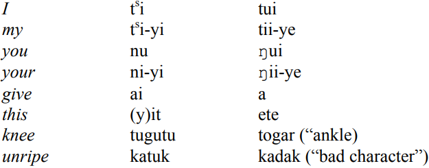 A. Recently, Ruhlen has documented close affinities between an obscure language of Nepal, Kusunda, generally classified as related to Chinese (Sino-Tibetan) and the language family of Papua New Guinea, called Indo-Pacific. Here are some common features between Kusunda and one of the languages of this group, Juwoi.