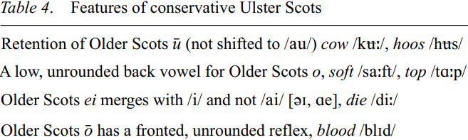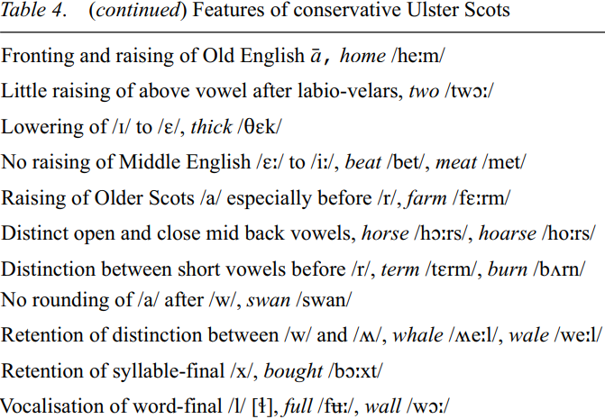 A treatment of Ulster Scots must start with differentiating between conservative Ulster Scots (braid, i.e. broad, Ulster Scots, which has its base in rural areas of Ulster) and more standard forms which are spoken chiefly in urban centres, parallel to the established distinction in Scotland between Lowland Scots and Scottish Standard English (Harris 1984: 119). An essential feature of standard Ulster Scots is that most words with non-standard Scots vowel values have re-allocated values which are nearer to those in general Ulster English. The following list illustrates vowel values and some consonantal features which are indicative of conservative Ulster Scots; the yardstick of reference is Older Scots (Older Scots), up to 1700, i.e. before the emigration to Ulster began.