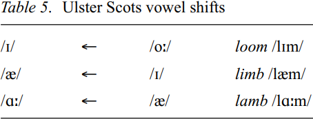 The shifts of vowel values in Ulster Scots when compared to southern British English have led to a re-alignment of vowel space. This can best be indicated diagrammatically as follows. The first shift one should note is that of Middle English /o:/ to a front vowel, with or without rounding, i.e. Older Scots