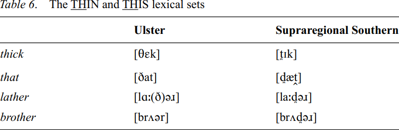 In the entire area of Ulster the THIN and THIS lexical sets show fricatives. The only exception to this are areas of contact with Irish (in County Donegal) where one finds
