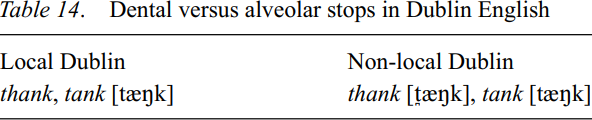 The English language has been spoken in Dublin since the late 12th century. English never died out in the capital and there are some features of vernacular Dublin English which can be traced to the first period. The records of Dublin English are slight and consist before 1600 mainly of municipal records which here and there betray the kind of English which must have been spoken in the city (Henry 1958). For a historical background to present-day speech one must look to the elocutionist Thomas Sheridan (the father of the playwright Richard Brinsley Sheridan) who in 1781 published A Rhetorical Grammar of the English Language with an appendix in which he commented on the English used by middle class Dubliners, the “gentlemen of Ireland” in his words, which he regarded as worthy of censure on his part. When discussing consonants, Sheridan remarks on “the thickening (of) the sounds of d and t in certain situations”. Here he is probably referring to the realization of dental fricatives as alveolar plosives as found in vernacular forms of Dublin English today. There is no hint in Sheridan of anything like a distinction between dental and alveolar plosive realizations, which is an essential marker of local versus non-local speech today.