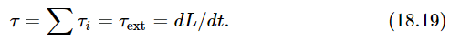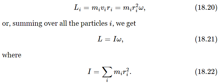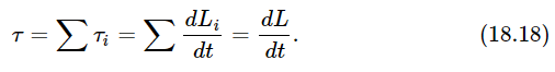 Now we shall go on to consider what happens when there is a large number of particles, when an object is made of many pieces with many forces acting between them and on them from the outside. Of course, we already know that, about any given fixed axis, the torque on the ith particle (which is the force on the ith particle times the lever arm of that force) is equal to the rate of change of the angular momentum of that particle, and that the angular momentum of the ith particle is its momentum times its momentum lever arm. Now suppose we add the torques τi for all the particles and call it the total torque τ. Then this will be the rate of change of the sum of the angular momenta of all the particles Li, and that defines a new quantity which we call the total angular momentum L. Just as the total momentum of an object is the sum of the momenta of all the parts, so the angular momentum is the sum of the angular momenta of all the parts. Then the rate of change of the total L is the total torque:
