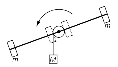 This is the analog of the law that the momentum is mass times velocity. Velocity is replaced by angular velocity, and we see that the mass is replaced by a new thing which we call the moment of inertia I, which is analogous to the mass. Equations (18.21) and (18.22) say that a body has inertia for turning which depends, not just on the masses, but on how far away they are from the axis. So, if we have two objects of the same mass, when we put the masses farther away from the axis, the inertia for turning will be higher. This is easily demonstrated by the apparatus shown in Fig. 18–4, where a weight M is kept from falling very fast because it has to turn the large weighted rod. At first, the masses m are close to the axis, and M speeds up at a certain rate. But when we change the moment of inertia by putting the two masses m much farther away from the axis, then we see that M accelerates much less rapidly than it did before, because the body has much more inertia against turning. The moment of inertia is the inertia against turning, and is the sum of the contributions of all the masses, times their distances squared, from the axis.
