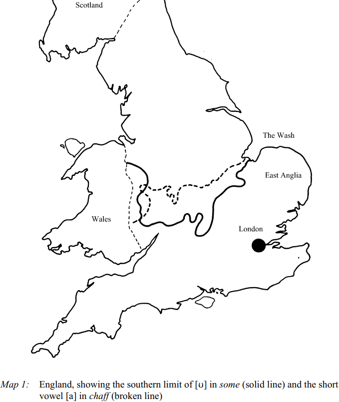 According to Trudgill in his The Dialects of England (1999), the major dialect boundary in England today is the line separating the North from the South. This line also has an acknowledged folk-linguistic status since it is used “informally to divide ‘southerners’ from ‘northerners’”. In linguistic terms, it consists of two major isoglosses marking the northern limit of two historical developments which are referred to by Wells (1982) as the FOOT-STRUT split and as BATH broadening. The FOOT-STRUT split is a sound change by which the Middle English short vowel u underwent a split resulting in phonemic contrast between