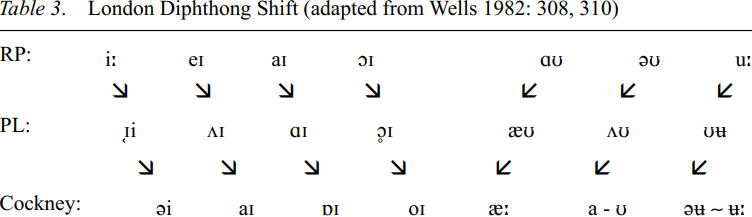 If described with reference to traditional RP, London and Southeastern long vowels and diphthongs are involved in a diphthong shift which Labov (1994: 170) describes as “the closest replication of the Great Vowel Shift that can take place under the present conditions”. In addition, there is social variation within the Southeastern system with working-class variants being even more advanced than their middle-class counterparts.