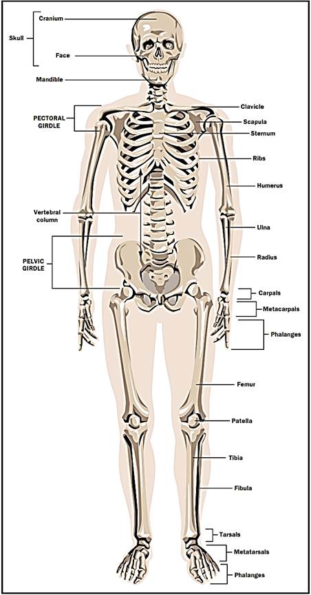 The 206 bones of the adult human skeleton occur in several distinctive parts of the skeleton. The skull, vertebrae, and ribs belong to the axial skeleton. The bones of the arms and legs and the pectoral and pelvic girdles are parts of the appendicular skeleton, which attaches to the axial skeleton.