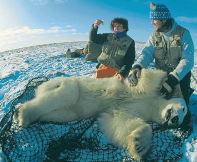 Biologists take samples from a drugged polar bear for data about pesticides in the Hudson Bay area of Manitoba.