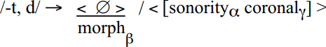 As a process operating in real time on the speech stream, many phonologists consider (-t, d) to be strictly a surface process, not a more foundational process (such as a Level-1 Process in models of Lexical Phonology). Santa Ana (1996) claimed otherwise, stating that the full range of conditioning effects on ChcE (-t, d) can be ordered in terms of the basic level concept of syllabification. He offered four generalizations. First, in ChcE, syllable stress is not a factor in deletion, which is a feature expected in stress-timed languages like English. Second, for both preceding environment and following environment, there is a correlation of the conditioning segment sonority to the frequency of deletion of the alveolar stop. An increase of the sonority of the preceding segment is correlated with increasing deletion. Conversely, a decrease of the sonority level of the following segment is correlated with an increase in deletion. Third, ChcE (-t, d) is correlated to [± coronal] place of articulation of the adjacent segment. Finally, regarding morphological categories, ChcE speakers attend to the regular past tense and past participle morphology of English, and tend to simplify alveolar stop clusters that carry this inflectional morphology at a very low rate. Santa Ana (1996) schematized ChcE (-t, d) as follows: