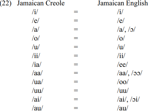 The only difference between the vowel inventories of the two language varieties involves the vowel /ɔ/ which exists in JamE but not in JamC. There is, therefore, for most vowels, a one-to-one relationship between JamC and JamE variants in cognate lexical items. However, there are three JamC vowels for which there are two possible JamE reflexes. These all involve the JamE vowel /ɔ/ , once as a simple vowel and twice as part of the complex vowels, /ɔɔ/ and /ɔi/ . Below are presented the vowel variants or reflexes across the two language varieties.