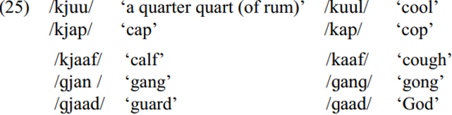 Cassidy and Le Page (1980: xxxix) treat [c] and [Ɉ] as palatal consonant phonemes. By contrast, Devonish and Seiler (1991) treat them as consonant plus semi-vowel sequences, i.e. as combinations of /k/ or /g/ and /j/. We opt for the latter analysis. Were they underlyingly palatal stops, one would expect that they would also occur in the coda, as do all the other oral stop consonants. The consonant and semi-vowel is consistent with what we have noted about the structure of the onset, i.e. that the semi-vowel must immediately precede the vowel. Below are minimal pairs or near minimal pairs demonstrating the contrast between /kj/ and /gj/ on one hand, and /k/ and /g/ on the other.