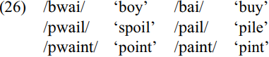 Like the phonetic palatals, the labialized velars, [pW] and [bW], do not occur in syllable-final position and seem best dealt with as onset clusters consisting of stop consonant, /p/ or /b/, followed by the semi-vowel, /w/. The distribution is more restricted than the phonetic palatal stops, with [pW] and [bW] only normally occurring before the diphthong /ai/. Below are some minimal pairs illustrating the contrast between /pw/ and /bw/ on one hand, and /p/ and /b/ on the other.
