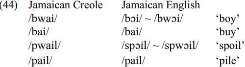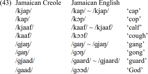 Let us first take the palatals. In JamE, /kj/ and /gj/, phonetically palatal stops, [c] and [Ɉ] , have a distribution in which they vary with each other before /a/ and /aa/ but not in other environments. Thus, the item ‘cap’ has two realizations in JamE, /kap/ and /kjap/, whereas the items ‘coo’ /kuu/ and ‘queue’, /kjuu/ show a /k/ versus /kj/ phonemic contrast. The JamE /kap/ ~ /kjap/ ‘cap’ variation reflects the fact that /kj/ is part of the lexical specification of cognate items in JamC, serving to distinguish it from /kap/ ‘cop’. With the JamE pronunciation of ‘cop’ being /kɔp/, the use of /kj/ in /kjap/ has no distinctive functional value. It, however, represents a carry-over from JamC which, we argue, provides the lexical input that lies at the base of JamE phonetic output.