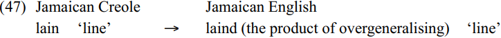 Consonant clusters follow a pattern in the coda characteristic of standard varieties of English around the world. Because more complex clusters are allowed in JamE than in JamC, some users of JamE are prone, beginning with a JamC lexical entry, to overgeneralize the conversion process as in the example below. This occurs with the creation of an /nd/ consonant cluster in the attempted JamE item below, based on the assumption that all rather then only some JamC /n/ codas had to be converted to JamE as /nd/.
