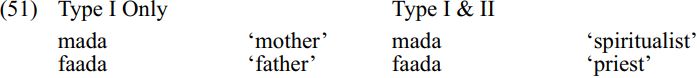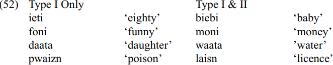 Even where no minimal pairs exist, bisyllabic items with prominence on the first syllable have to be lexically specified for the ability to take type II prosody. Below is a sample.