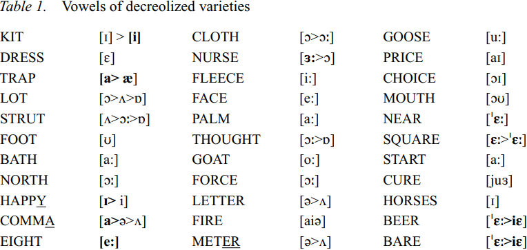 With such a measure of variation in mind we can proceed to table 1 below, which sets out Wells’ list of 28 items with most typical norms represented. Where there are significant differences from other national varieties these are bolded, and where there is a range of variation about the norm this too is specified. Overall it will be noted that there is a tendency to produce as monophthongs what in other national varieties are diphthongs. Four items are added finally from the extended Foulkes/Docherty listing and one other, BARE: