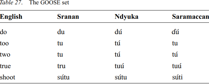 The GOOSE set of words, corresponding to ME /o:/, is represented in Suriname creoles by the English words shoot, spook, loose, spoon, fool, too, lose, do, two, and so on. The normal realization of these words in the Suriname creoles is [u], a short high back round vowel. Because of the lack of a length distinction this means that there is no contrast with the FOOT set.