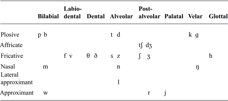 The consonant system of New Zealand English is set out in the table. There is nothing unexpected in this system except possibly the lack of /M/, which is discussed below