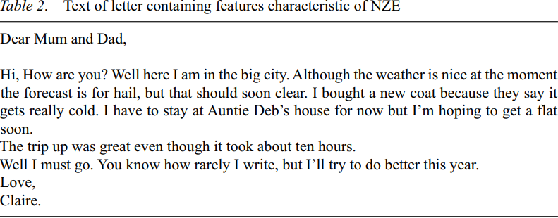 Differences because of social class are clearly identifiable in present-day NZE. The three young women in the accompanying audio clip were selected in terms of social class. Karen is from a middle social class, Christine from a lower social class and Wendy from a higher social class. However, the recordings can be clearly differentiated linguistically as can be heard in the accompanying audio clip. Wendy speaks Cultivated NZE, Karen General NZE and Christine Broad NZE. The letter they are reading is widely used in investigations of NZE. It contains most of the key vowels in stressed position. The text is given in Table 2.