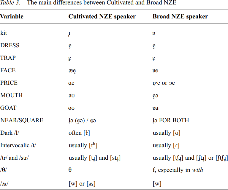 . We noted that the /M/ ~ /w/ contrast is still maintained by some speakers in Southland. Some older women from the higher social classes from other parts of the country also maintain this distinction, but more often in reading than in speech. Table 3 compares the pronunciation of Cultivated and Broad speakers of NZE. Most of these features are illustrated in the recordings.