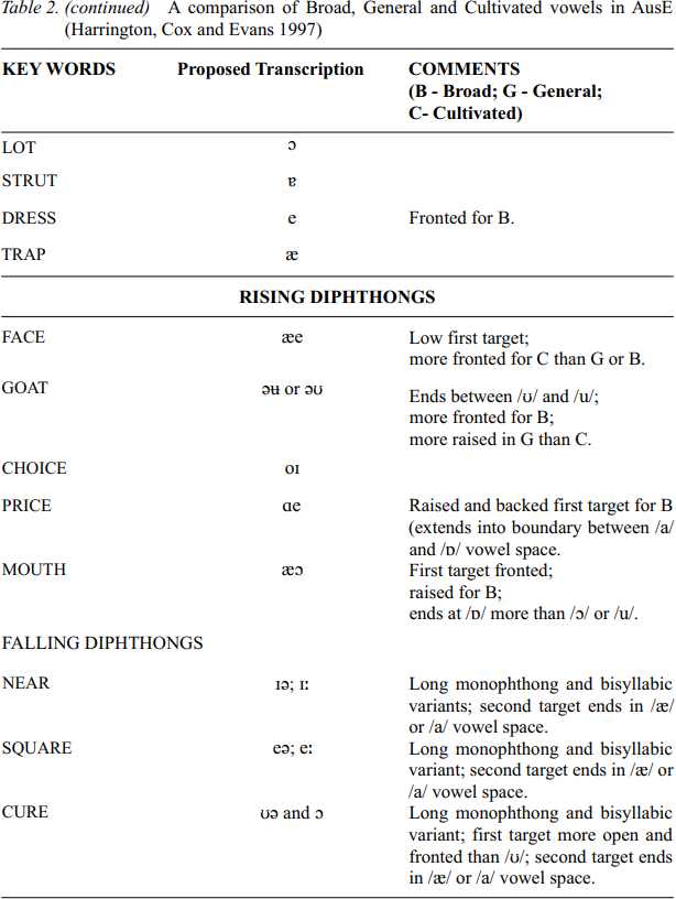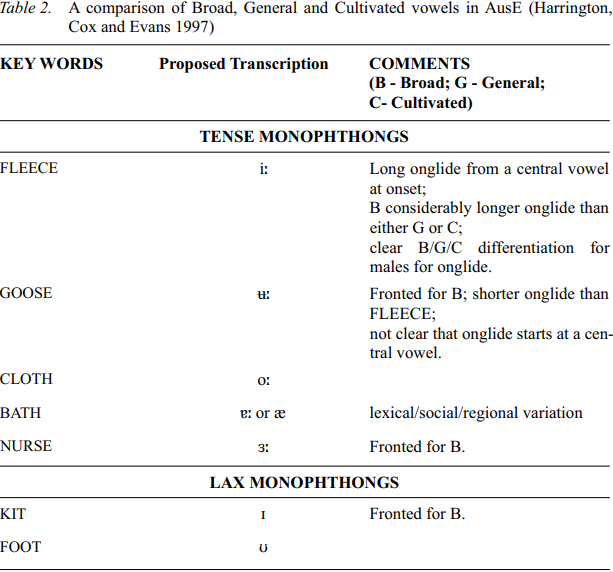 The acoustic description of AusE vowels by Harrington, Cox and Evans (1997) involved a sample of 119 men and women who had been identified as speakers of Broad, General and Cultivated AusE; the goal was to describe the characteristics of the vowels that differentiate the three varieties. Table 2 shows the phonetic symbol or symbols that, according to Harrington, Cox and Evans (1997) best describe the vowel in AusE; however, much of the variability associated with one or the other of the varieties is lost in the choice of a single symbol. The comments on the table indicate the variability associated with each vowel. Harrington, Cox and Evans (1997) divide the vowels into four types: tense and lax monophthongs and rising and falling diphthongs.