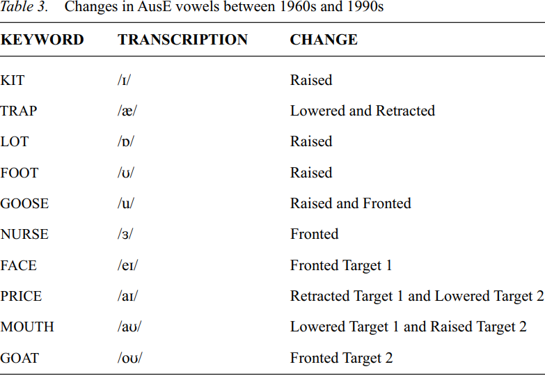 A number of phonological changes have been studied since the descriptions of AusE by Mitchell and Delbridge and Bernard first appeared. Cox and Palethorpe (2001: 25–29) compared their acoustic study of vowels collected from a group of men during the 1990s with a similar acoustic study reported by Bernard (1970) who collected his data in the 1960s, also from males. The summary of the changes are shown in Table 3. They note that these changes follow patterned relationships. The raised second target of the MOUTH vowel follows the raised LOT vowel and the fronted second target of the GOAT vowel follows the fronted GOOSE vowel. The fronted GOOSE and NURSE vowels represent a parallel shift and raised LOT and FOOT provide an example of a change shift.