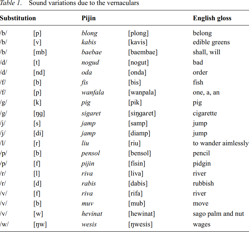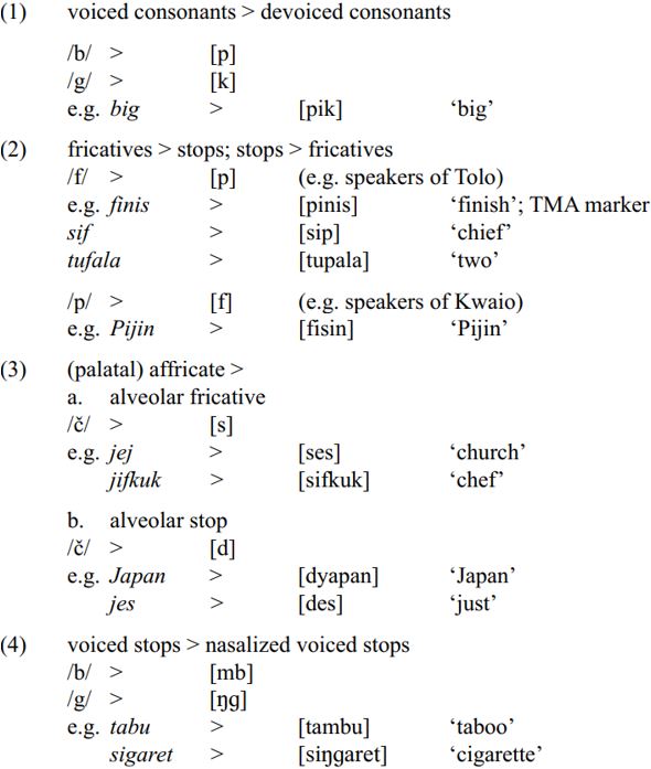 As not all the languages of the Solomon Islands have all the consonantal phonemes of ‘standard’ Pijin as it is coming to be codified, they will characteristically replace some Pijin consonants with the closest equivalents available in their vernaculars. They contrast, where possible, with the more canonical ones in no more than a single distinctive feature. Below are some examples of frequent substitutions.