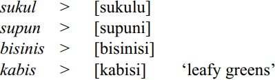 Just as vernaculars permit fewer consonant clusters, very seldom do they have words ending with consonants. And just as epenthesis can break up unwanted consonant clusters, paragogue is used in avoidance of word-final consonants. Most rural speakers, and older speakers for whom vernaculars are the overwhelming medium of communication will tend to add a final vowel to Pijin words derived from English words ending in a consonant, again according to the same principle of vowel harmony. Hence, several of the words listed above may be further expanded as follows, in order to arrive at preferred CV(CV) syllable structures: