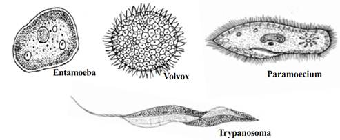 The nutrition is either autotrophic or heterotrophic. They reproduce either asexually or by sexual methods. Ex: Amoeba, Paramecium, Plasmodium.