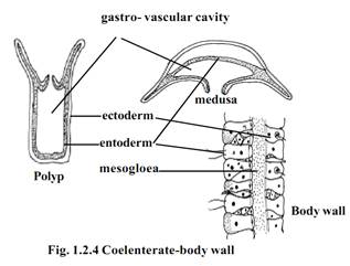All coelenterates are aquatic animals. They are mostly marine. The body is radially symmetrical. The body wall is of two layers of cells. The outer layer is called the ectoderm. The inner layer, entoderm is separated from the ectoderm by a non-cellular mesogloea. The mesogloea is a jelly-like substance. Due to the presence of two layers in the body wall, these are said to be diploblastic animals.