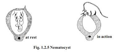 Many coelenterates exhibit polymorphism. In this phylum, organisms exist in two different body forms namely, a polyp, and a medusa. The ectoderm contains stinging cells called nematocysts (cnidoblasts). These cells when triggered can explosively penetrate prey and inject poison.