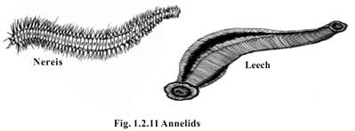 This phylum includes three Classes, namely Polychaeta, Oligochaeta and Hirudinia. The polychaetes are marine worms. They have a distinct head. There are pairs of lateral projections called parapodia. The examples are Nereis (ragworms), Arenicola (lugworm).
