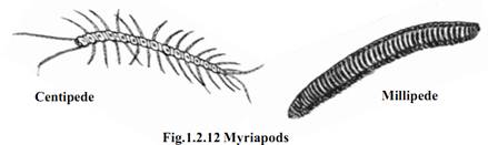 Class Myriapoda: - It includes centepedes and millipedes. These organisms have a distinct head and simple eyes. The centepedes have a pair of poison claws. The body consists of numerous segments, bearing pairs of legs.