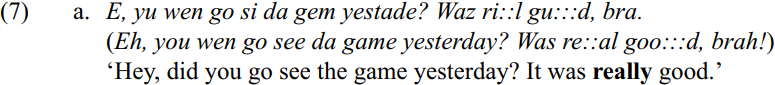 The combination of full vowels rather than schwa and secondary stress in nonprimary-stressed syllables means that syllables in Hawai‘i Creole tend to have more equal prominence in terms of loudness and duration than syllables in English. There is also greater stress than in English on function words, such as articles, prepositions, modals, and preverbal tense and aspect markers. Therefore, Hawai‘i Creole is usually classified as a syllable-timed language, rather than a stress-timed language such as English (Vanderslice and Pierson 1967).