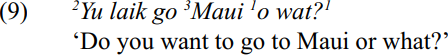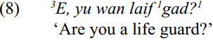 Tag questions with ye [jæ], e [ʔз] , ha [ha] and no are very common in Hawai‘i Creole. At the end of a sentence, they usually have high pitch with terminal rise. Another tag is also used: o wat (‘or what’). This is added to the end of a statement without pausing, and given low pitch and stress:
