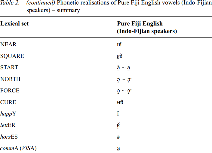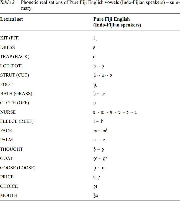 Table 2 provides a summary of the most common phonetic realizations of the vowels of Pure Fiji English as articulated by Indo-Fijians.